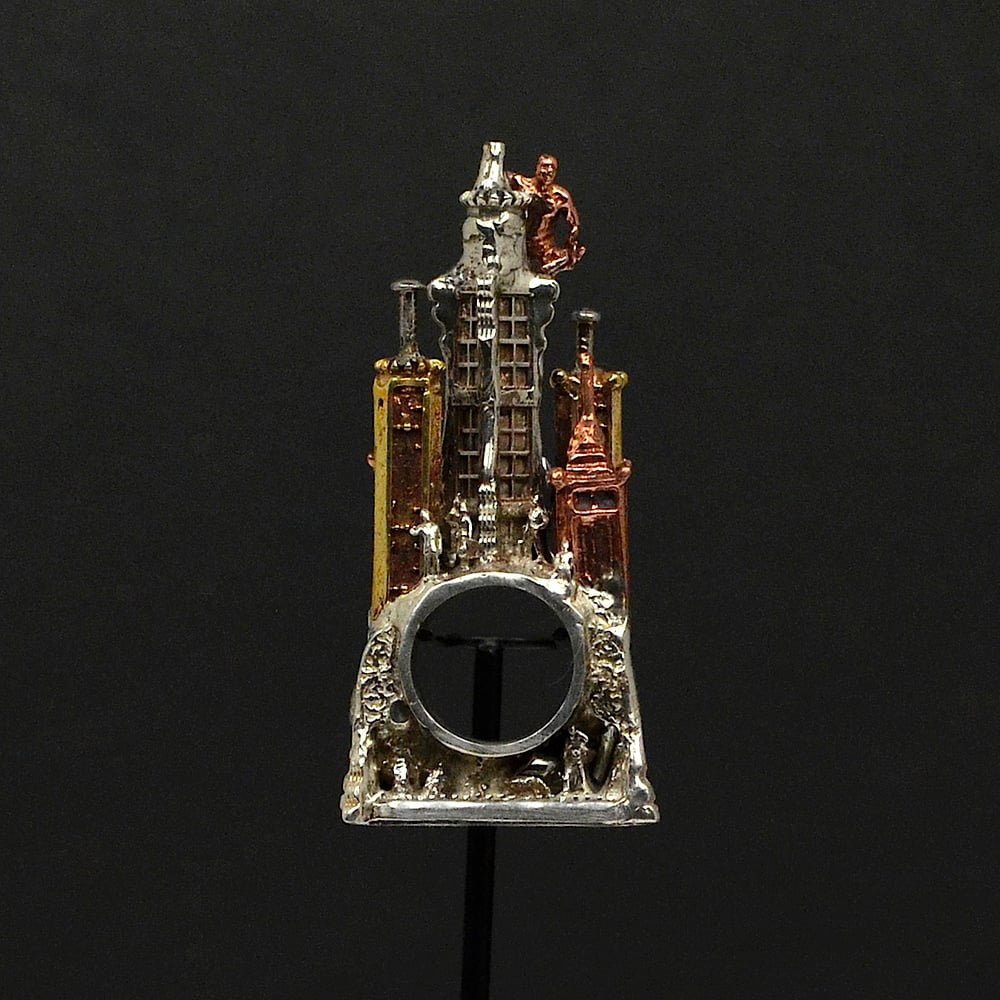 New Yorkers scurrying above and below the tunnel ring band, representing the inner beauty of the city. The skyscrapers are dwarfed by the ominous King Kong clutching the top of the tower. The buildings at the time were inspired by but not representative of the famous NYC skyscrapers in the summer of 2001.